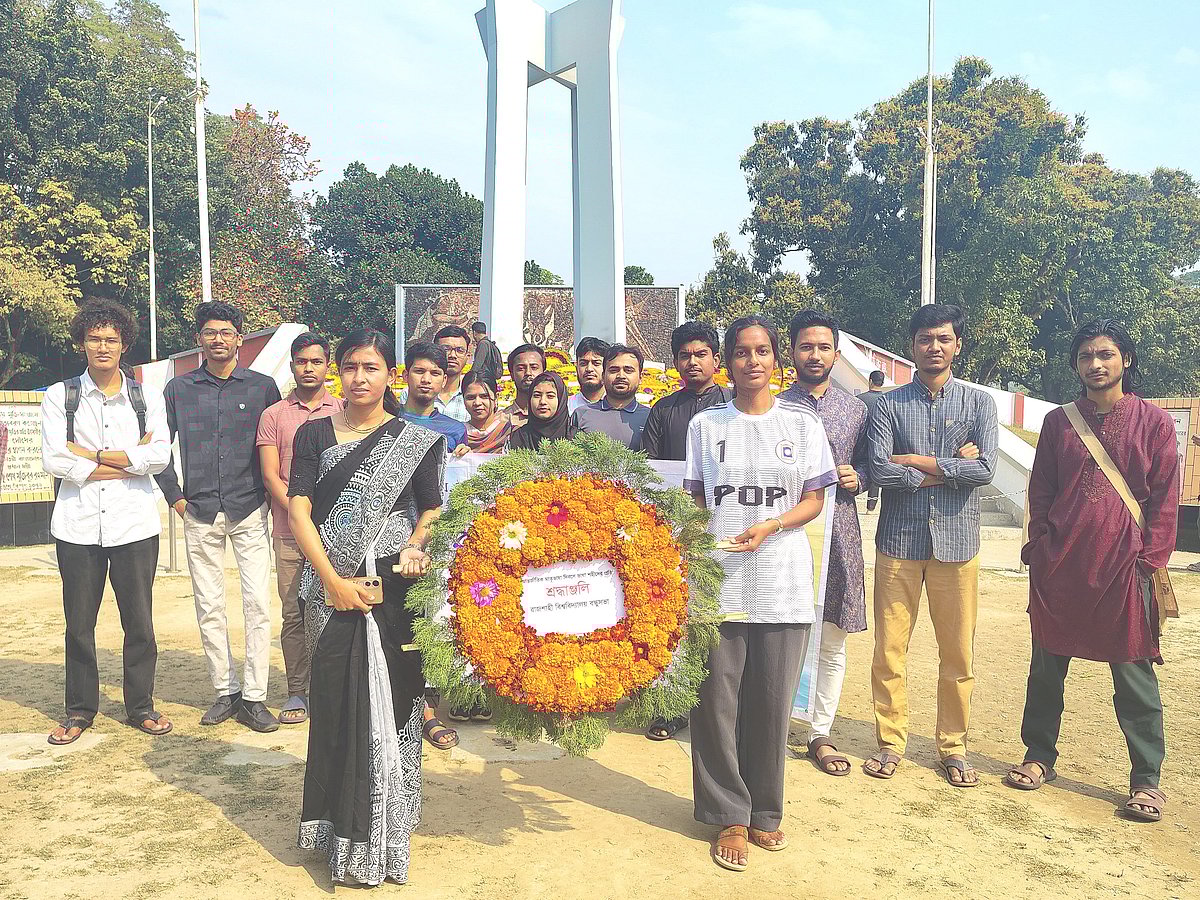 রাজশাহী বিশ্ববিদ্যালয়ের কেন্দ্রীয় শহীদ মিনারে রাবি বন্ধুসভার পুস্পস্তবক অর্পণ।পাঠাগার ও পাঠচক্র সম্পাদক মুয়াজ্জিন হোসাইন বলেন, ‘আন্তর্জাতিক মাতৃভাষা দিবস শুধু স্মরণের দিন নয়, বরং নিজের ভাষা ও সংস্কৃতিকে ভালোবাসার নতুন অঙ্গীকারের দিন।’