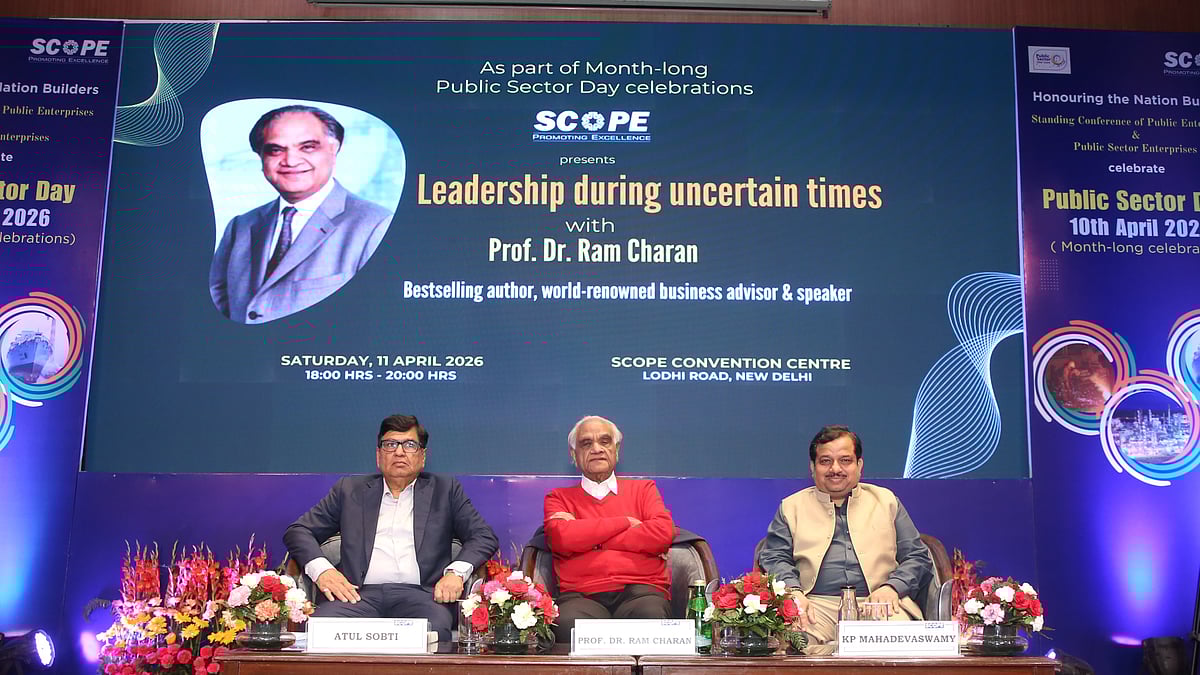 SCOPE organized a lecture and interaction on ‘Leadership in Uncertain Times’ with Prof. Dr. Ram Charan, world-renowned business advisor and bestselling author in the presence of K.P. Mahadevaswamy, Chairman, SCOPE & CMD, NBCC & Atul Sobti DG, SCOPE. The session organized as part of Public Sector Day celebrations was attended by distinguished guests including Members, PESB; Senior Officials from various Ministries and Government Departments including DPE, SCOPE Executive Board Members and CMDs, Directors of Public Sector. The session addressed the complexities of the modern economy for leaders and empowered participants with insights on leveraging uncertainty as a catalyst for institutional growth and success.