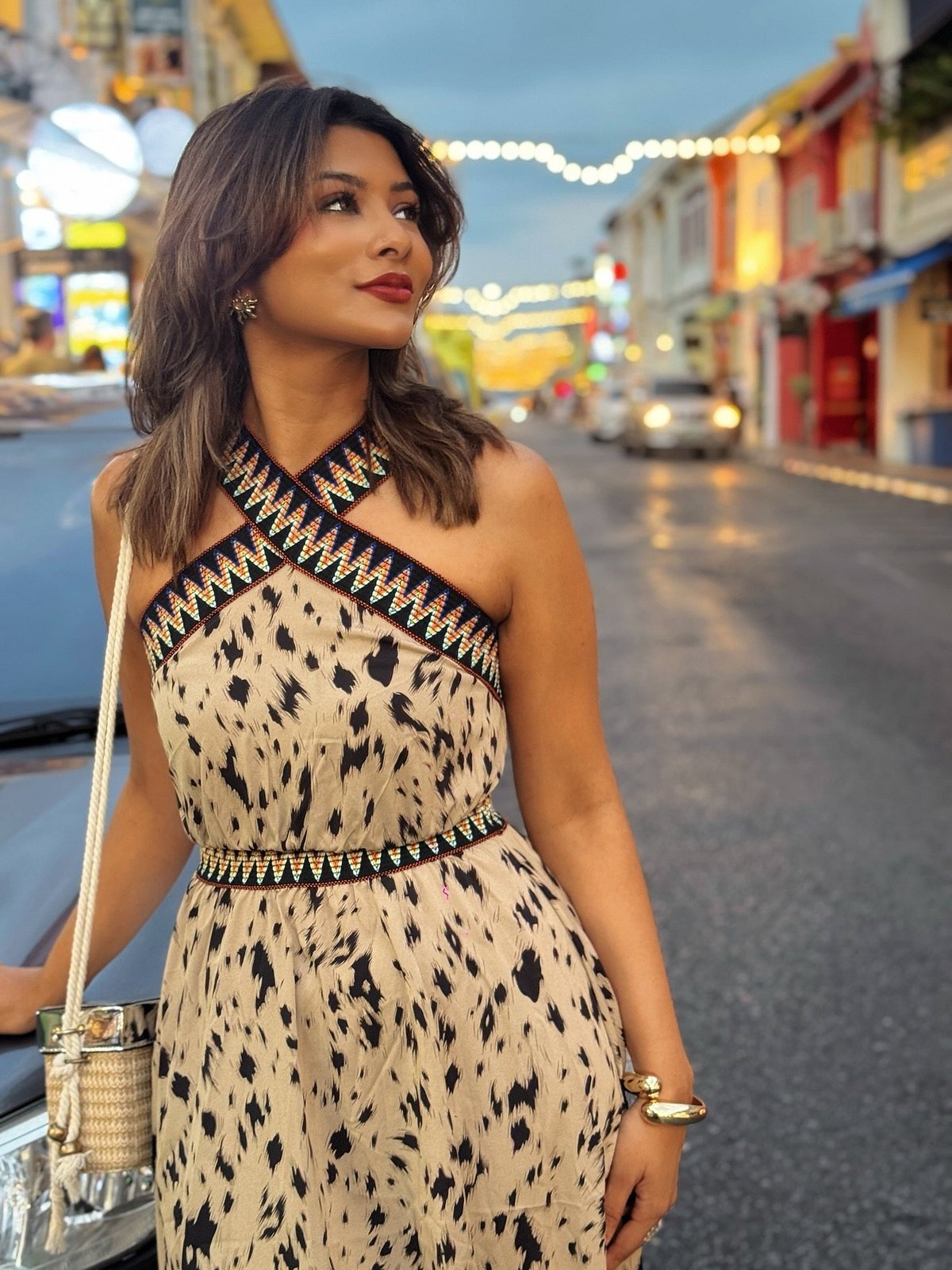 তার এই লুক তৈরি করেছে এক ধরনের বোহো-চিক ভাইব, যা ট্রাভেল ফ্যাশনের সঙ্গে দারুণভাবে মানিয়ে যায়। টয়া পরেছেন একটি অলওভার প্রিন্ট ক্রিস-ক্রস হল্টার নেক ড্রেস।